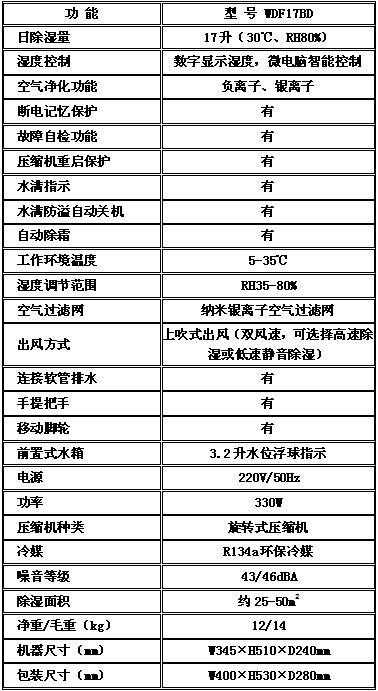 关键词:日除湿量17升,上吹风方式。自动控制、湿度显示、负离子净化,水箱容量3.2升。